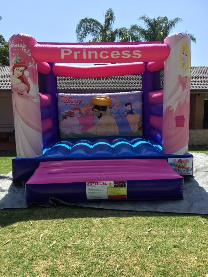 Princess themed open front bouncer with shade sail. Castle has a basketball hoop.