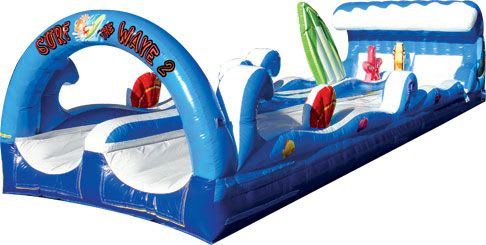 Surf the Wave slip and slide is a bright and shiny inflatable sure to stand out at any event. Featuring sloped double slip n slide lanes its great for schools, sports clubs, events and big parties : allowing lots of riders per hour.